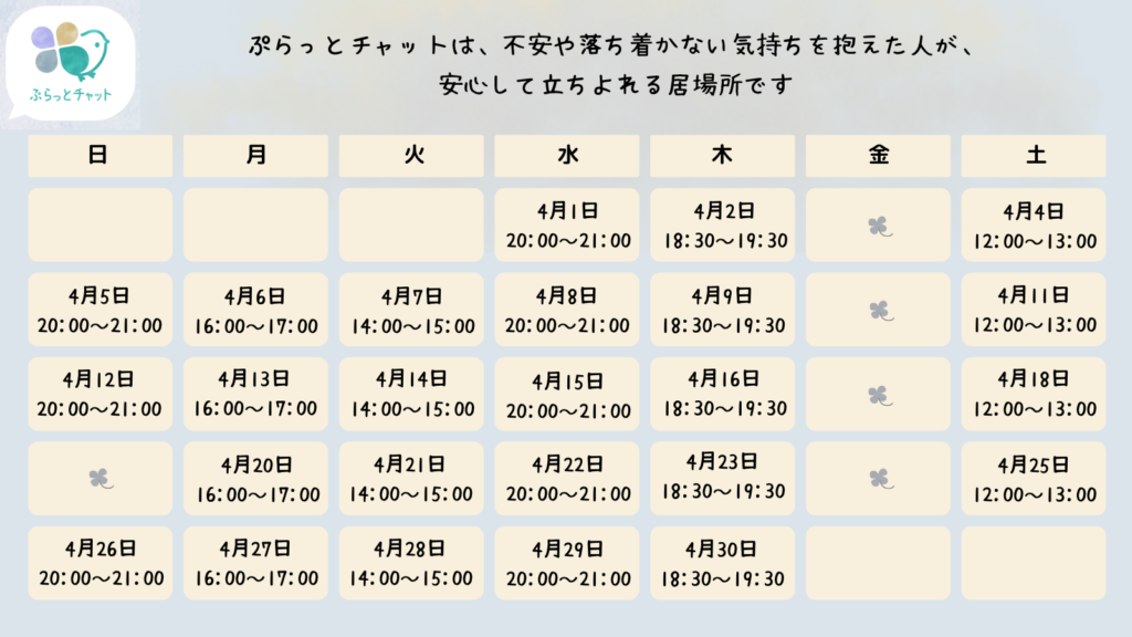4月のぷらっとチャット開催スケジュールが仮決定しました